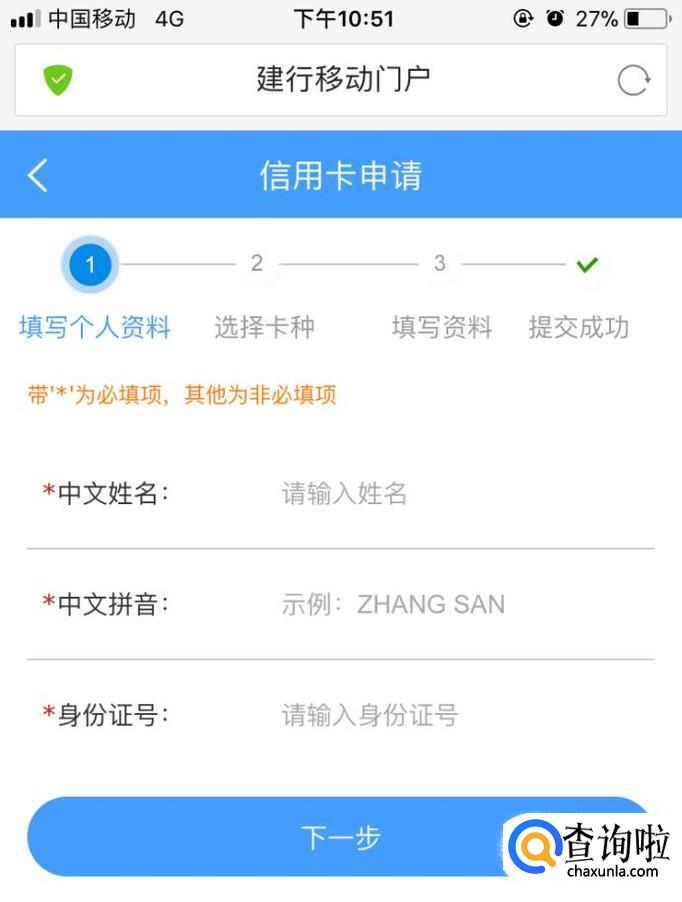 如实填写身份信息,选择卡种,填写个人基本信息等,填写完毕提交申请。提交后,网上申请核准,手机短信提示编号AXXXXXX行用卡网上申请已核准,请尽快凭此短信及身份证原件至对账单地址附近建行网点确认申请。