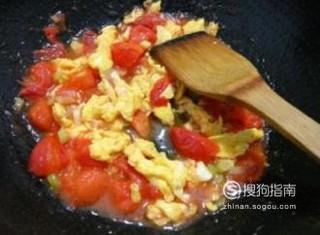 起锅烧油,油热后打入两个鸡蛋不断翻炒,然后加入切好的番茄块继续翻炒。