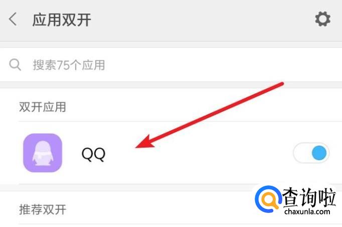 打开应用双开设置后,在这里把QQ的开关打开。这样我们的QQ就可以进行双开了。