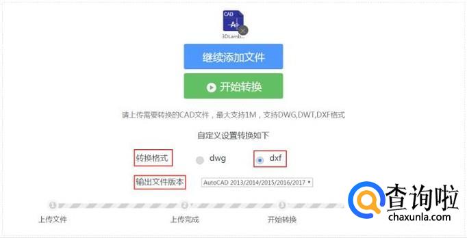 之后在“转换格式”栏选择选择好dxf格式。同时可以对“输出文件版本”进行需要的设置。如下图: