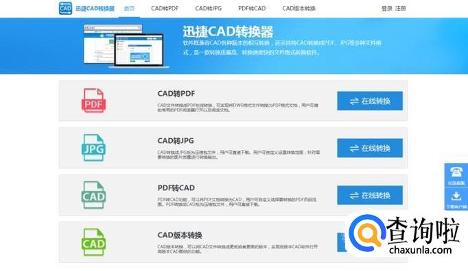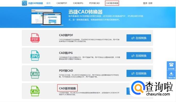 进入在线版CAD转换器官网后,可以直接点击界面顶端的“CAD版本转换”按钮,也可以选择“CAD版本转换”一栏右侧的“在线转换”按钮。如下图:
