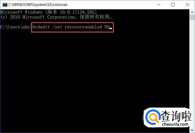 弹出的界面,我们输入bcdedit /set recoveryenabled NO,然后我们按回车键,这样我们就关闭了自动修复了。