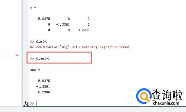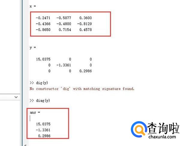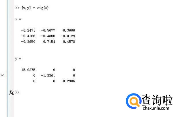 然后执行[x,y] = eig(a)公式,求出x,y的值,如下图所示