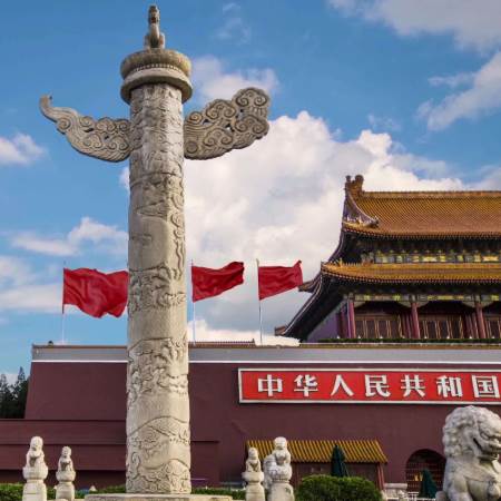 天安门前后各有一对汉白玉的柱子,名字叫华表,又称作“望柱”。华表上石犼(读hǒu,中国神话传说中北方食人之兽)蹲立,下面横插云板,柱身雕刻云龙,该华表与天安门同建于明永乐年间,迄今已有500多年历史。这一对华表间距为96米,显得端庄秀丽、庄严肃穆,是少有的精美艺术品。由于天安门门前那对华表上的石犼,面向宫外,后面的那对华表上的的石犼,面向宫内,故在古老的传说中,人们把宫前的石犼叫“望君归”,意为盼望皇帝外出游玩不要久久不归,应快回宫料理国事;面向宫内的石犼叫“望君出”,劝戒皇帝不要老待在宫内寻欢作乐,应常到宫外去了解百姓的苦难。每根华表由须弥座柱础、柱身和承露盘组成,通高为9.57米,其直径为98厘米,重约20000公斤。