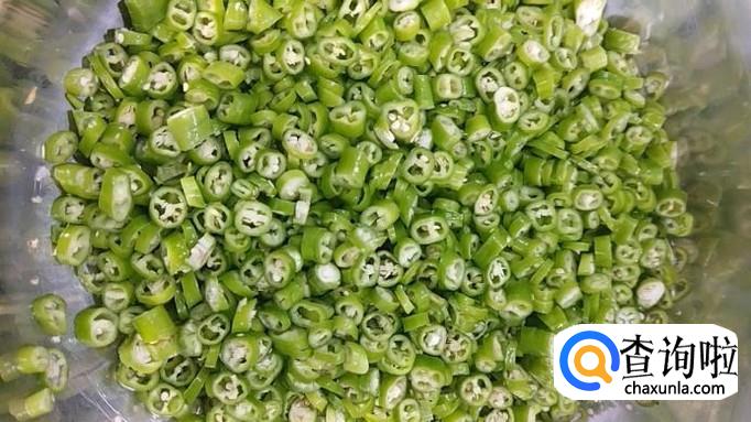 将准备好的朝天椒丁放入锅中,小火翻炒均匀。