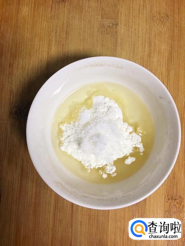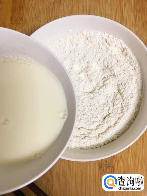 牛奶倒入碗中,放入微波炉中火30秒,然后加入1勺炼乳,搅拌至溶化后分次倒入面粉中。