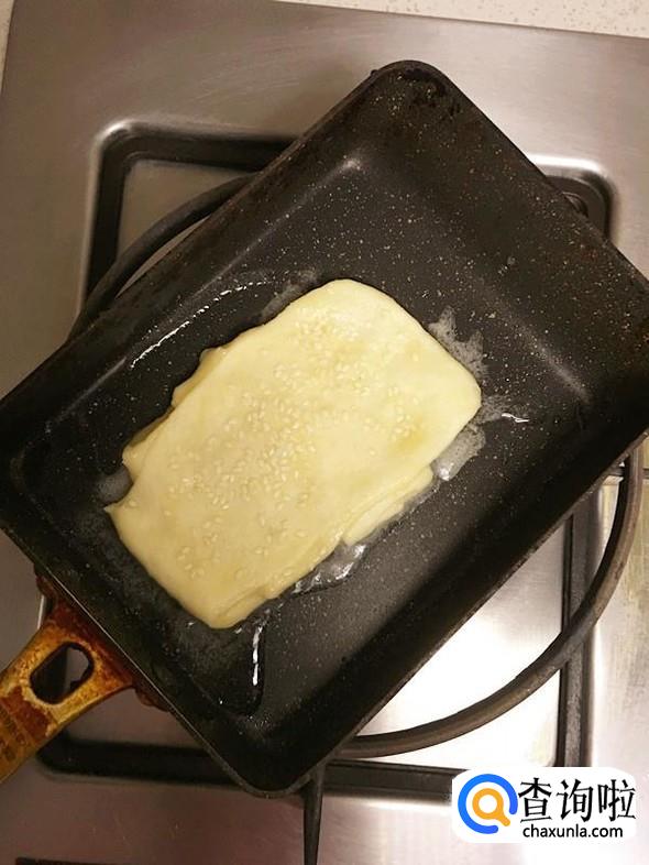 取出其中一个小段,两头略微捏紧,然后擀薄一些,表面抹上少许水,撒上白芝麻,放入平底锅,小火煎制。