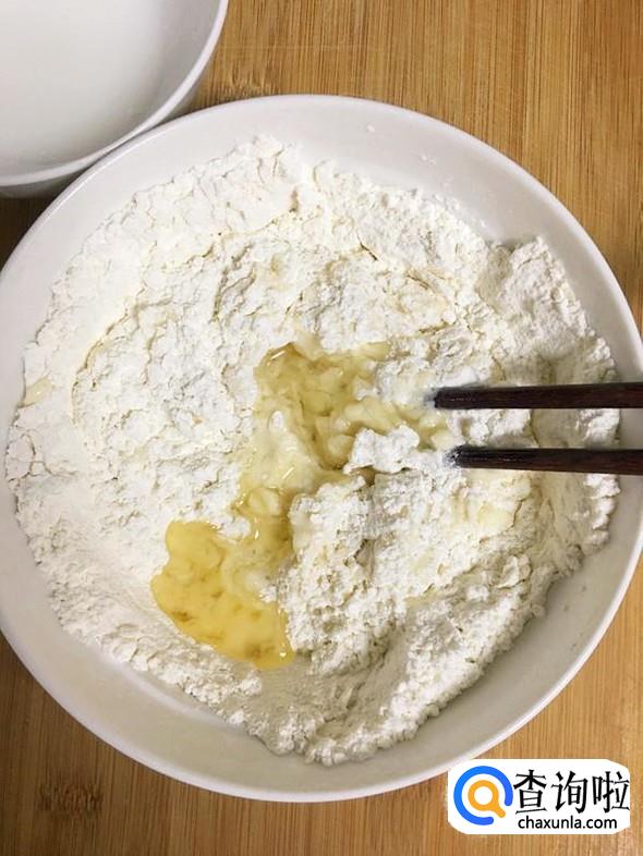 再倒入1小勺食用油,把面粉搅拌至棉絮状。
