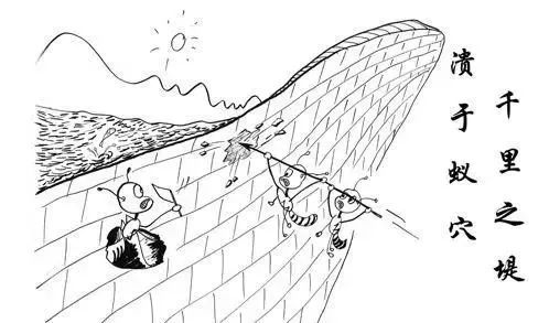 “千里之堤,溃于蚁穴”,是出自《韩非子·喻老》中的一句话,后来广为流传,并演变成为今天的一条哲理成语。这句话深刻揭示了千里长堤虽然看似十分牢固,却会因为一个小小蚁穴而崩溃的道理。更是警示我们世人,事情的发展是一个由小到大的过程,当存在微小的安全隐患时,如果不给予足够的重视和正确及时处理,就会留下无穷的后患。所以,我们在实际工作中要防微杜渐,从小事做起,及时处理好不安全因素,避免事故或灾难的发生。