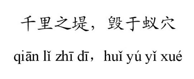 千里之堤溃于蚁穴指很长很长的堤坝,因为小小蚁虫的啃噬,最后也会被摧毁的。叫人不要小看自己的所犯的错误,一点点小错的积累会使你的人生毁于一旦。比喻小事不注意会酿成大祸或造成严重的损失。在高大的东西也需要一点一点积累,万事都遵循着这一个规律,在微小的事情都不要去忽视。
