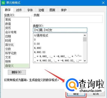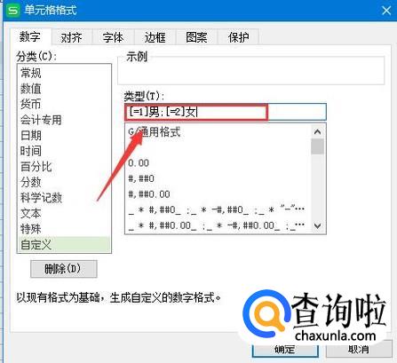 类型区域输入:[=1]男;[=2]女