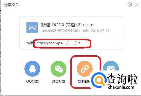 文档会上传到云盘上面,文件比较大的话上传可能需要一些时间。上传完毕,我们就可以分享文件了,如图所示,可以分享到QQ、微信、邮件等。我们点击“复制链接”。