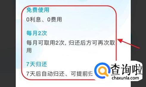 点击此页面下方的“玩转备用金”,这里有关于备用金的更详细介绍,比如它是0利息、0费用,每月取用2次,以及7天内归还,如图所示...