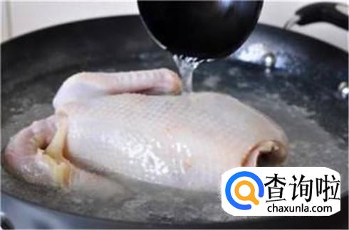 锅里加上多一些的清水,多切一些姜片和葱段,把姜片葱段放进去烧开,然后把整鸡放进去焯水,让鸡里面的血水出来一部分之后捞出来控水晾干。