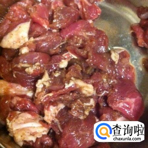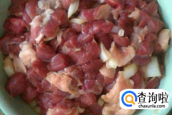 首先我们先把注备好的羊肉,切成一小块一小块的羊肉粒,然后放入一个容器中,根据羊肉的量倒入相应的料酒。