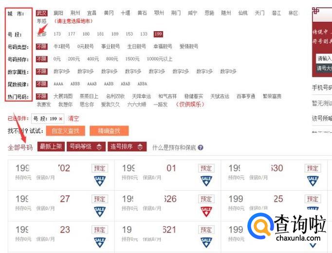 选择号码归属地、号段等,然后在列表中选中满意的号码