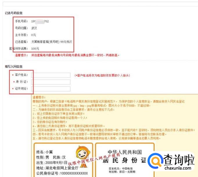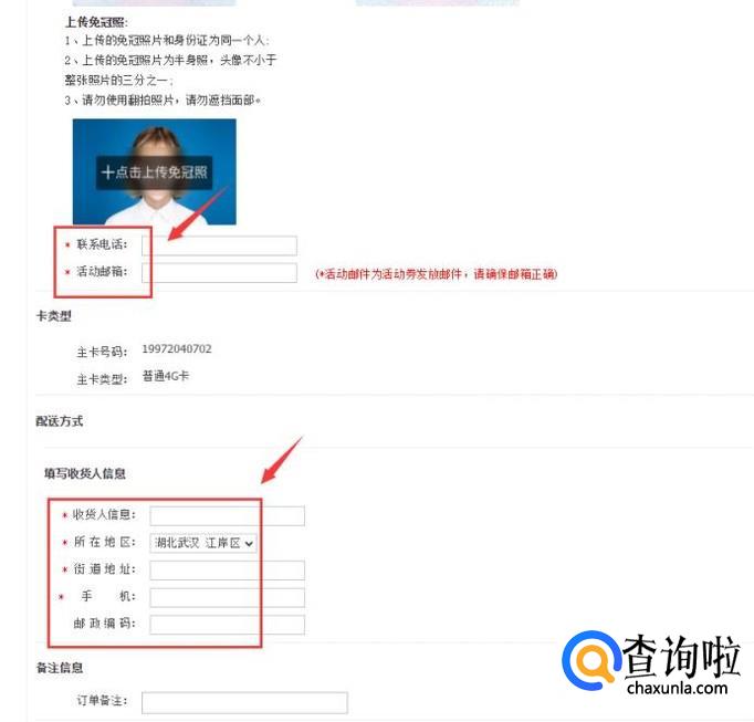 这里就需要我们输入入网信息了,也就是身份证件上面登记的姓名、号码、地址等,还要上传身份证件的正反面、个人免冠照片,其次还要填写收货人的相关信息,好让自己能够顺利收到运营商寄过来的手机卡。