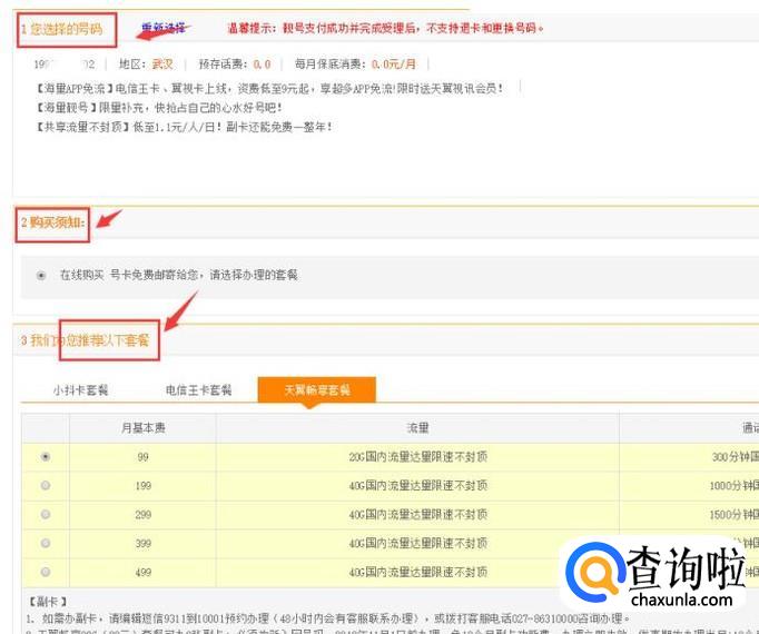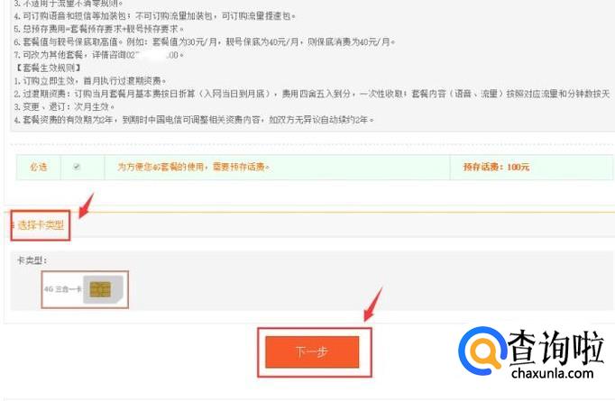 选中号码后,选择好需要的套餐,确定好用户须知和卡类型,点击下一步。