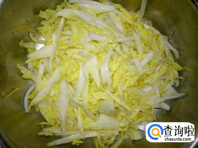 将娃娃菜洗净后,切去头部,然后切成小细条,放入盆里,加少量盐和糖,搅拌均匀,放置5-10分钟;