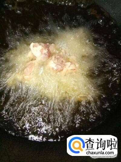 开火,加入较多食用油,将五花肉下入锅里,炸一分钟左右,炸至五花肉表面显金黄色,即可捞出,将多余的油倒去;