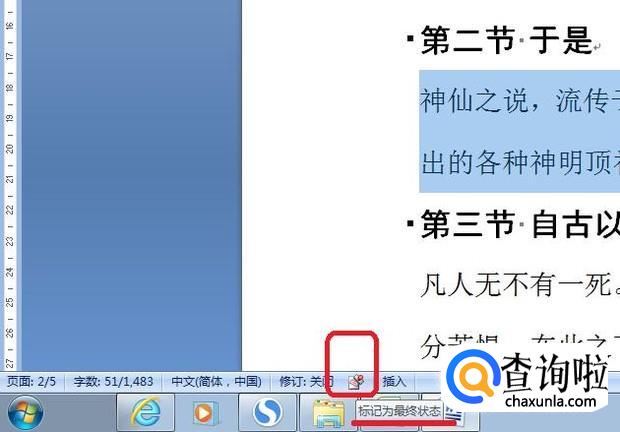 页面底部状态栏,有这样的图标,显示文档“标记为最终状态”。