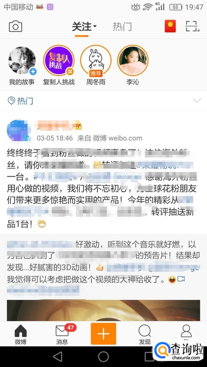 进入微博主页面后,在页面最下方有个放大镜标志,点击就行。