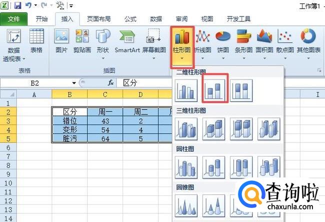 之后我们点击柱形图下方的下拉箭头,弹出的界面,我们点击堆积柱形图;