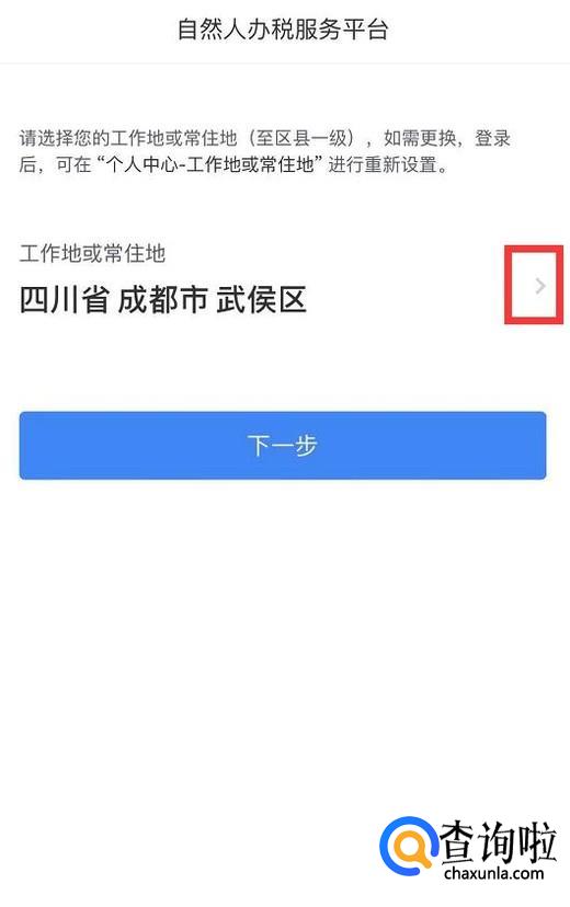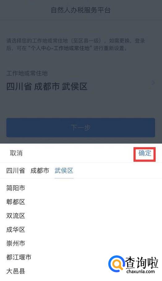 打开个人所得税APP,确认你的“工作地或常住地”显示是否正确(如果有误,点击“>”图标,在下拉列表中选择正确地址后点击“确定”即可),确认无误后点击“下一步”。
