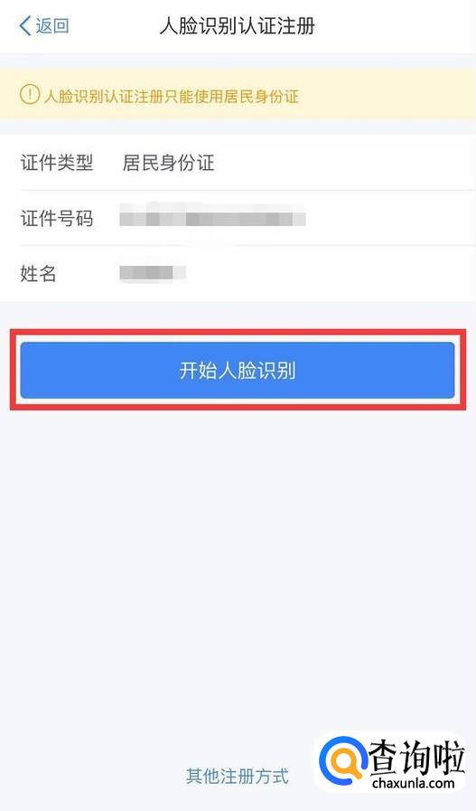 点击“同意并继续”,输入证件号码和姓名后,点击“开始人脸识别”,按要求完成识别程序。