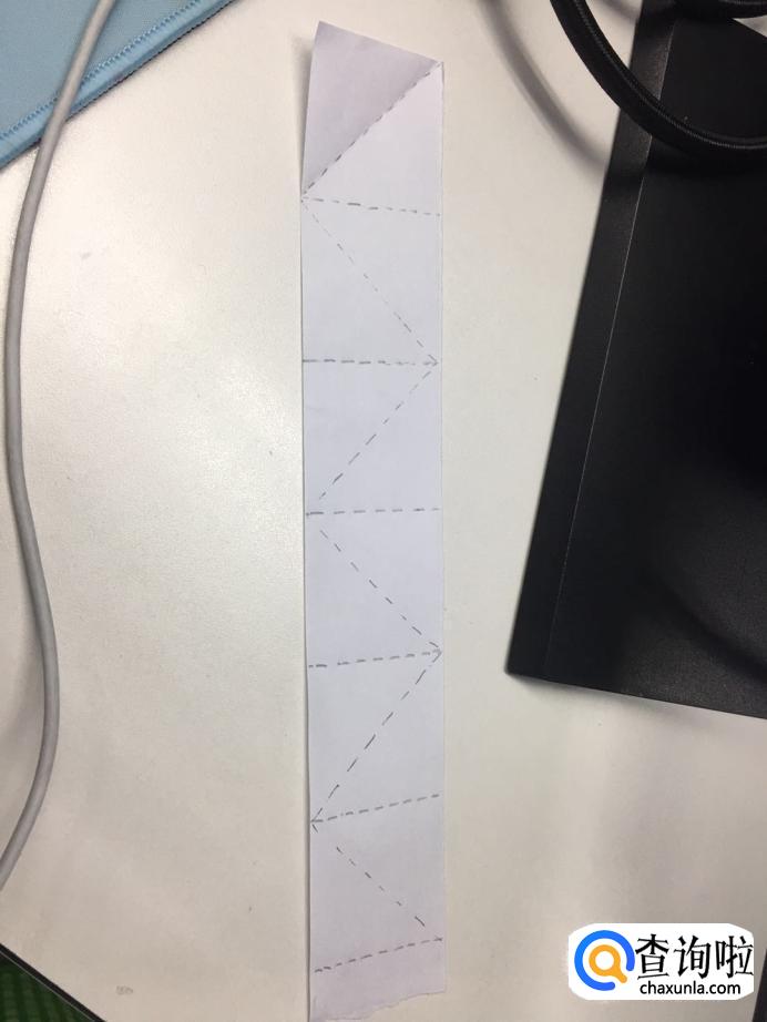 然后,我们在长方纸条上,利用尺画出6个正方形,每个正方形长4cm。画出正方形之后,继续画出每个正方形的对角线,依次相连,如图所示。