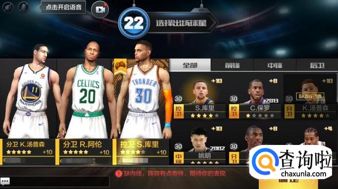 页面来到位置和球员选择,这个游戏的位置主要是由控卫+前卫+中锋,控卫最好有,中锋最好有,不然最次需要一个大前,不然篮板真的没保障。剩下一个位置就是分为和小前都可以的,如果阵容达到完美下方有一行文字会提示,阵容完美了就点击确定。
