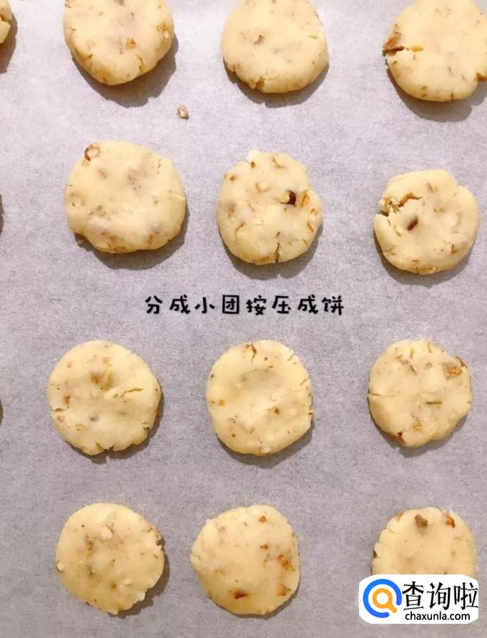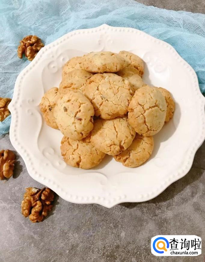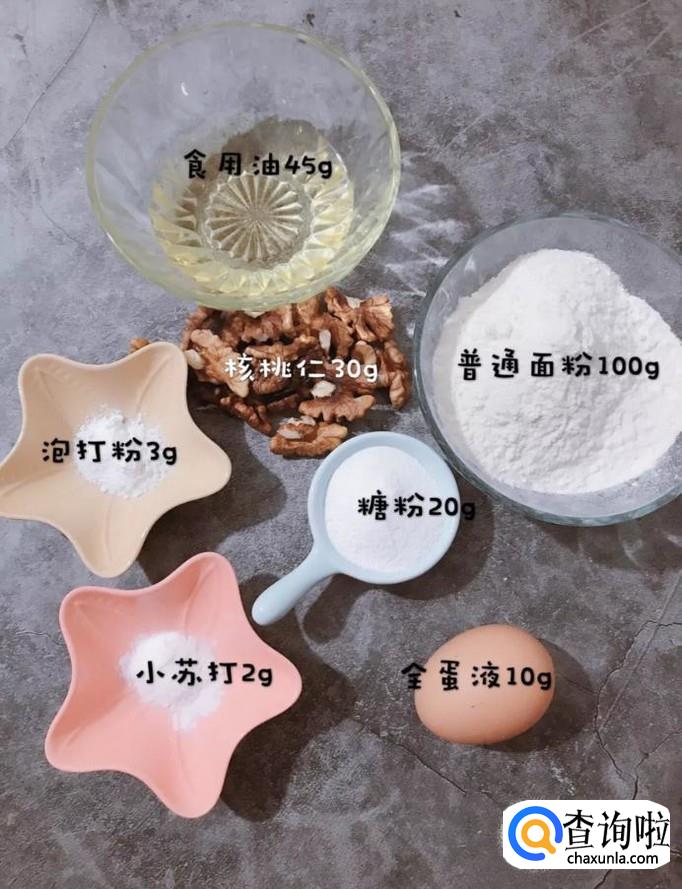 食材:食用油45克,核桃仁30克,泡打粉3克,小苏打2克,糖粉20克,鸡蛋一个,普通面粉100克。