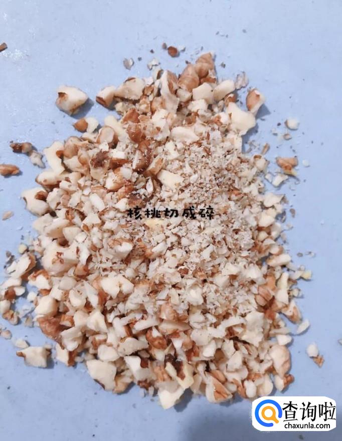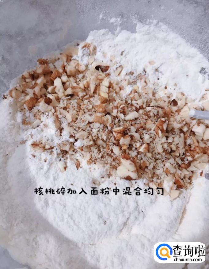 接着把切碎了的核桃加入面粉中混合均匀,如下图所示。