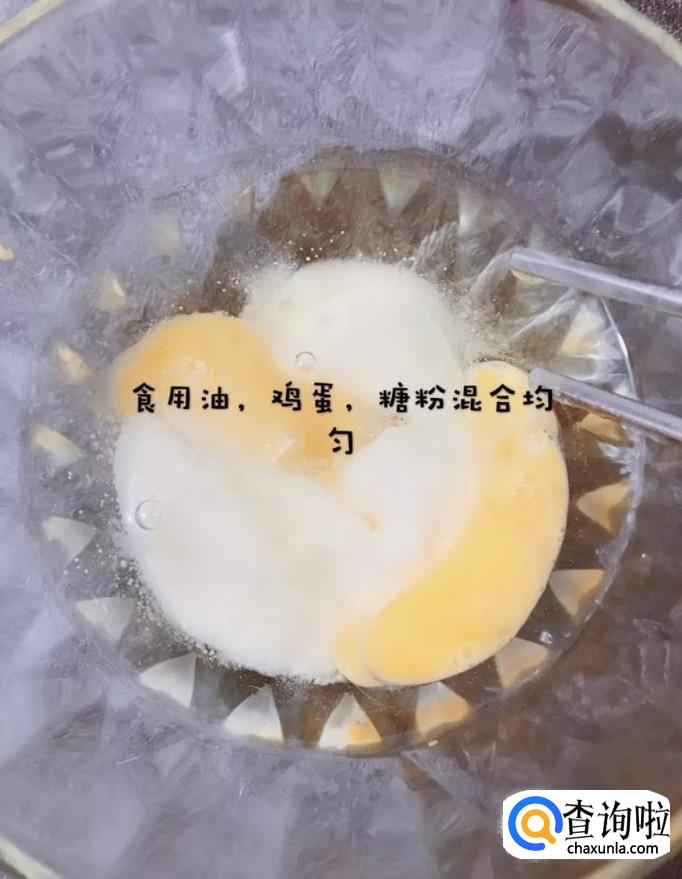 首先将食用油、鸡蛋和糖粉倒入碗中,混合均匀,如下图所示。