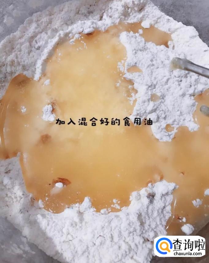 然后把刚才混合好的食用油倒入碗中,继续搅拌均匀,如下图所示。
