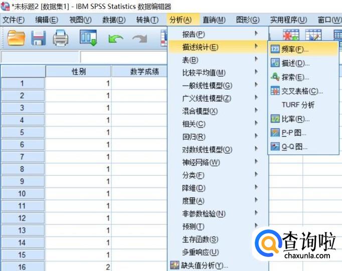 首先打开数据文件夹,其中“1”代表男,“2”代表女。依次点击“分析”--“描述统计”--“频率”,弹出频率对话框。