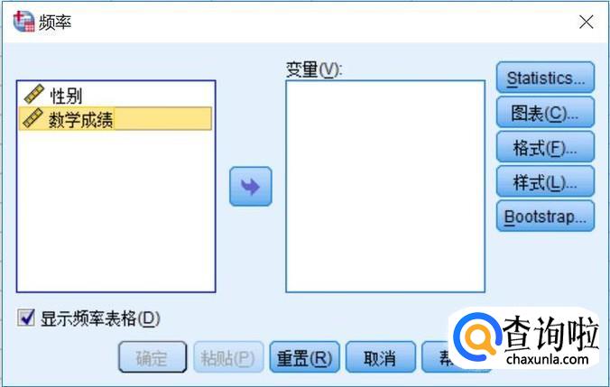 将对话框里的“性别”和“数学成绩”选入“变量”内,点击右边的”Statistics"按钮。