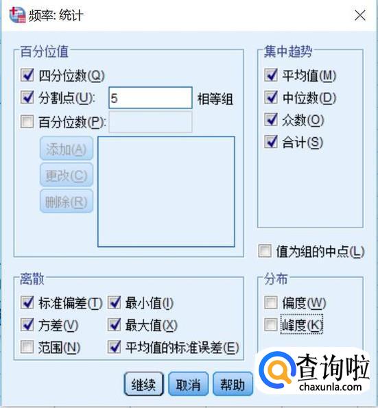 在统计对话框勾住想要显示的变量,比如“平均数”、“众数”等,点击“继续”,在主对话框中点击“确定”。