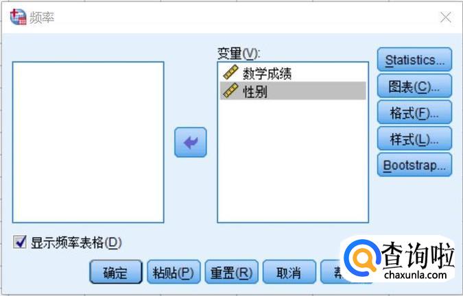 因为求性别对数学成绩的影响,因此将“数学成绩”选进“因变量列表”,将“性别"选进“自变量列表”。