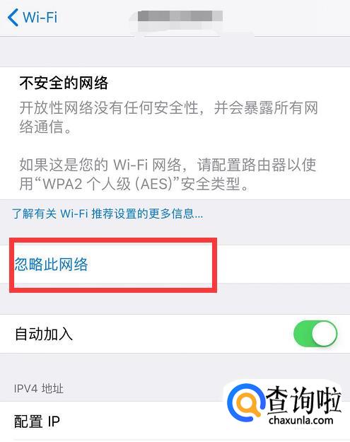 点击“忽略此网络”移出该WIFI。