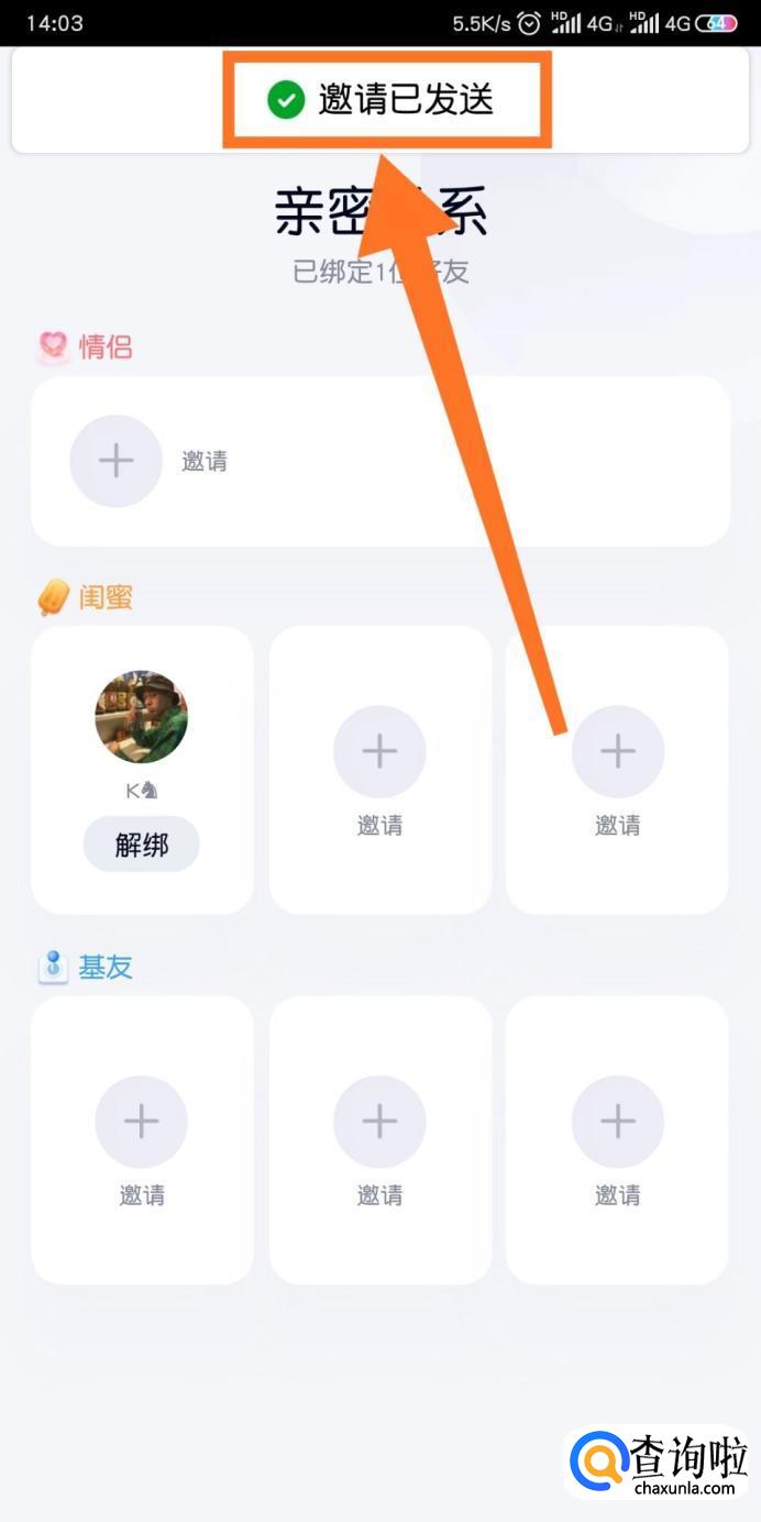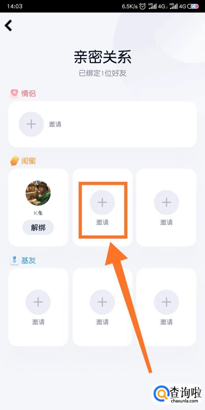 然后我们可以看到有情侣、闺蜜和基友,我们点击【闺蜜】下方的【邀请】。