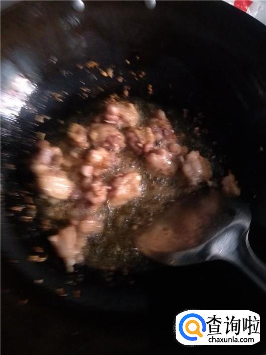 翻炒几秒后将鸡翅倒入,再次翻炒,要不停的翻炒,将鸡翅翻炒到表皮有金黄色以后可停下,这是为了让做出来的鸡翅更香。