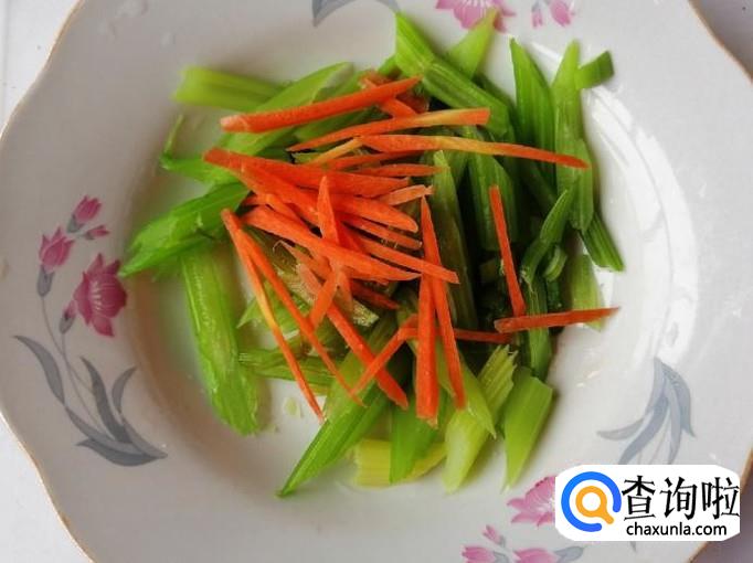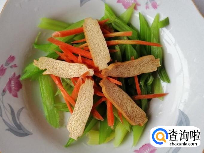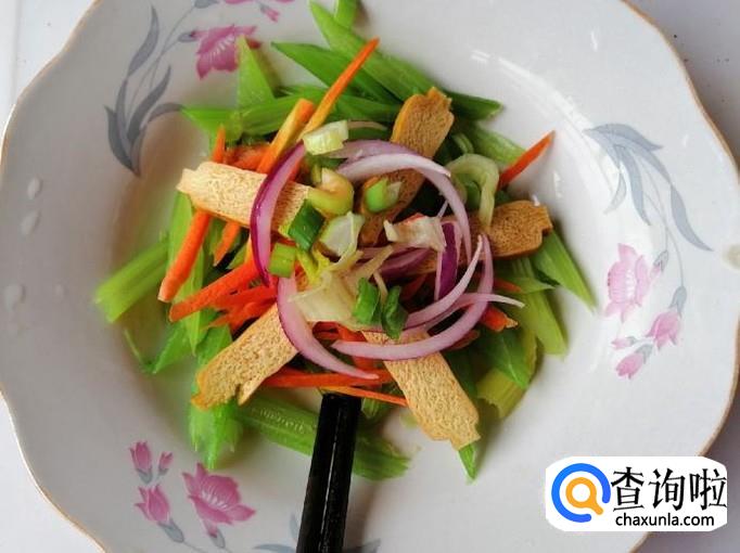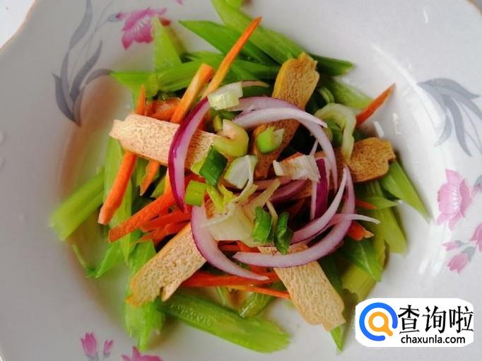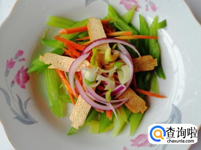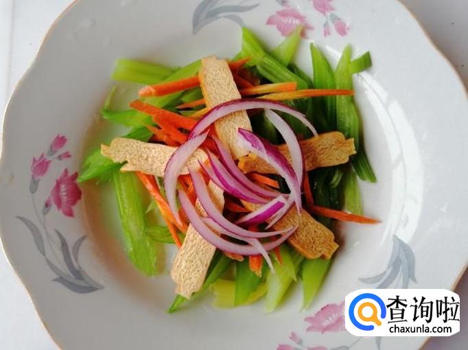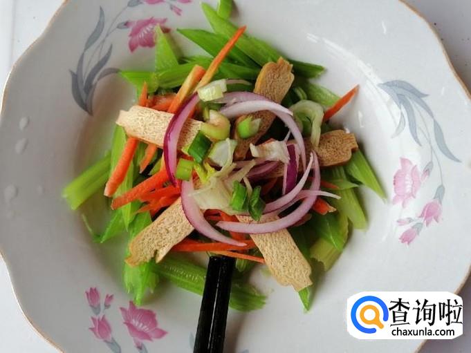把切好的胡萝卜丝放入芹菜盘中,然后再放入切好的豆腐干,之后再放入切好的圆葱丝,所有食材都放好备用。