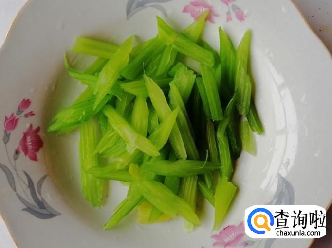 取适量新鲜的芹菜,用清水把芹菜洗净,然后选用芹菜杆部分,把芹菜杆切好,煮锅烧水,放入切好的芹菜,把芹菜烫熟捞出备用。