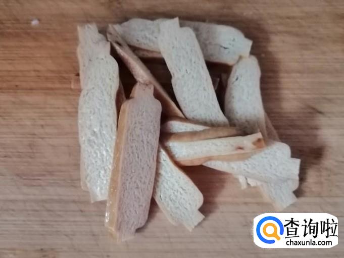 取适量新鲜的豆腐干,把豆腐干切成薄片备用,用量多少根据自己喜好定,注意如果豆腐干之前是,存放在冰箱里的话,取出来最好上锅蒸几分钟。