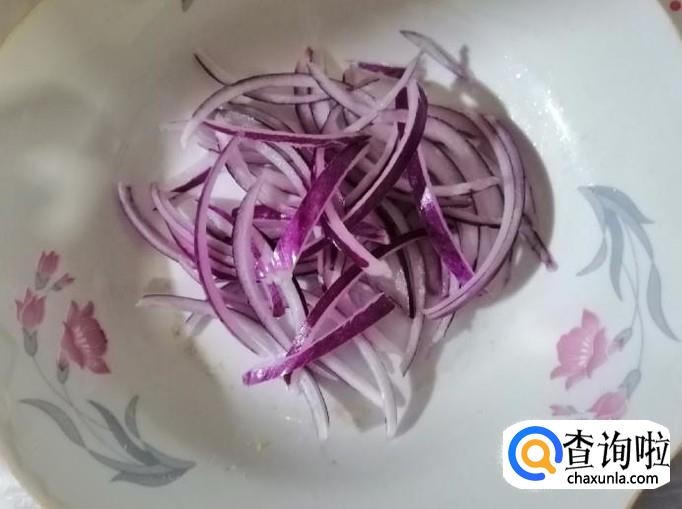 取适量新鲜的圆葱,扒掉圆葱外皮,切掉头尾,用清水把圆葱洗净,然后把圆葱切成细丝待用。