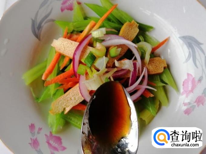 适量芹菜、胡萝卜、圆葱、豆腐干、葱、食盐、香醋、生抽、香油