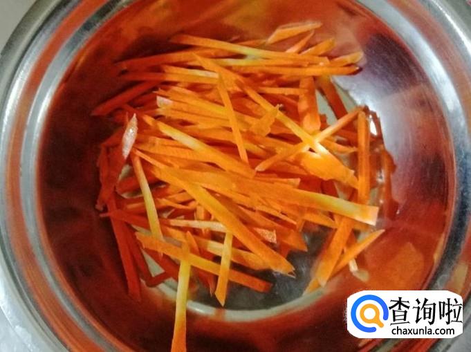 取一小根新鲜的胡萝卜,用清水把胡萝卜洗净,用刀切掉胡萝卜两头,然后把胡萝卜切成细丝备用。