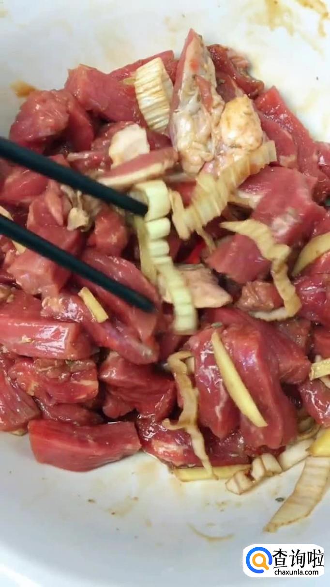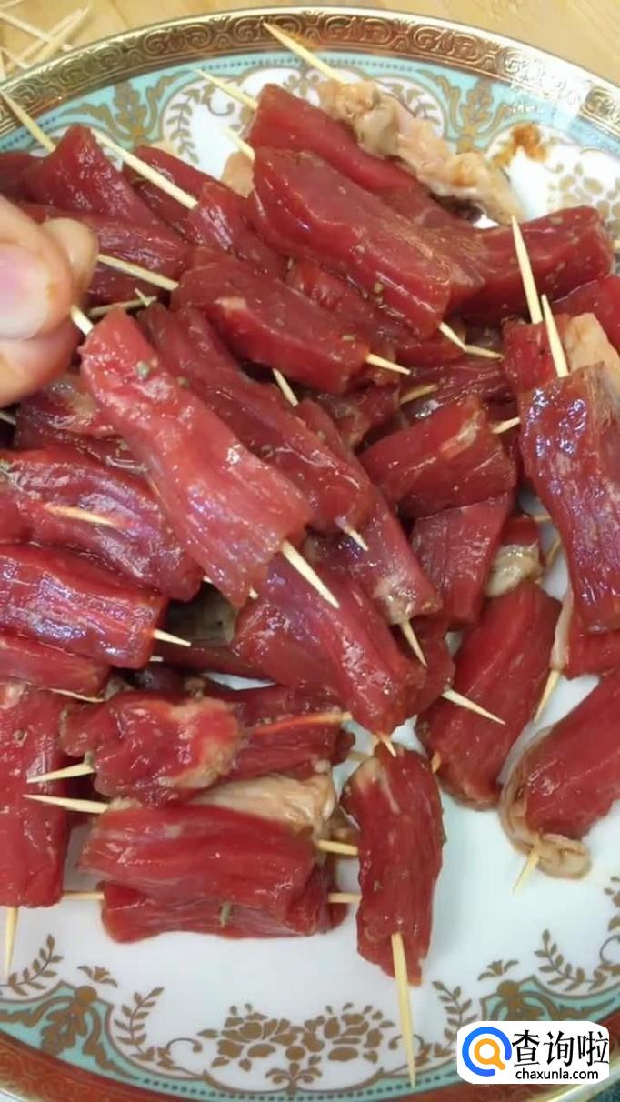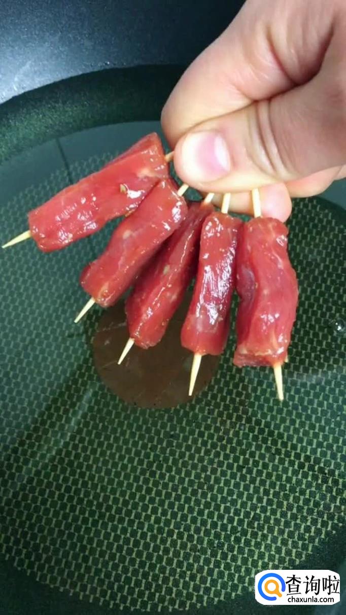 然后用牙签穿上牛肉腌制一个小时,如下图所示。