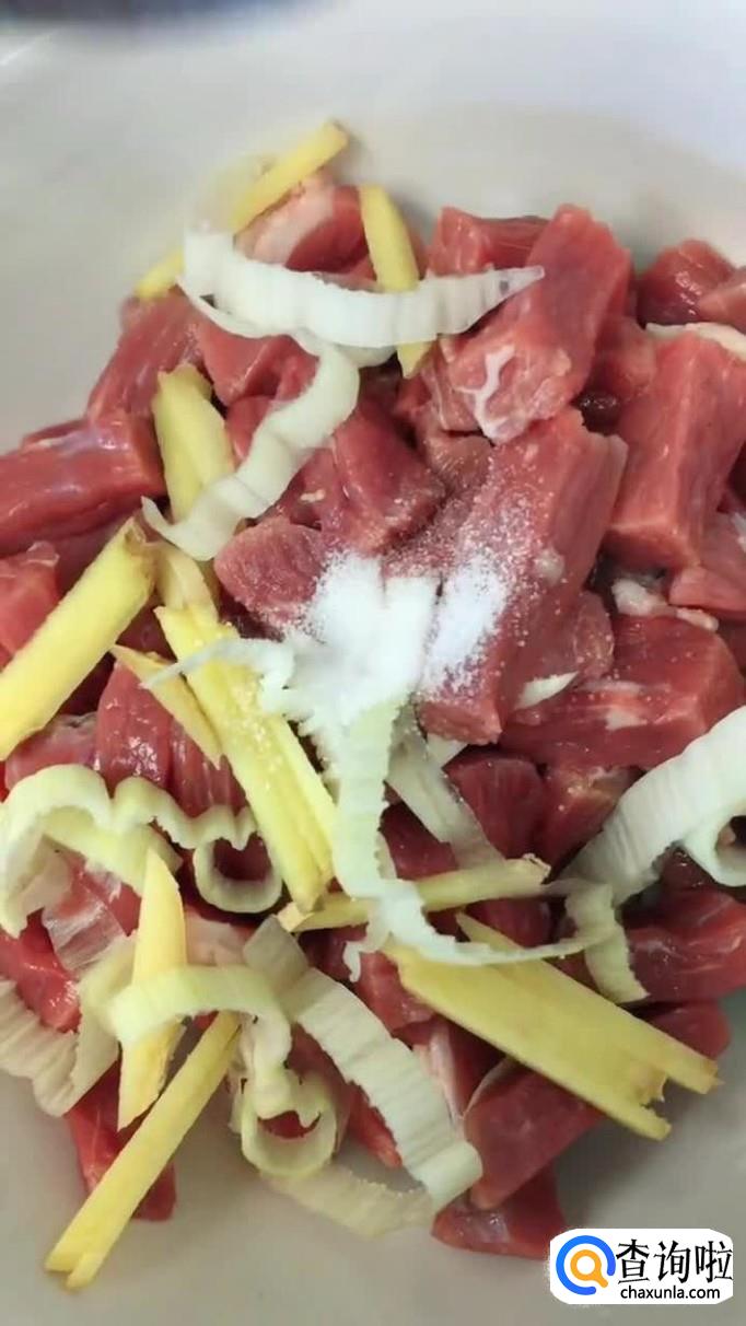 然后将牛肉装进碗内加入适量的生姜丝和大葱段,如下图所示。